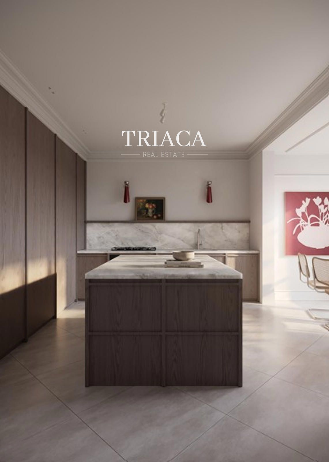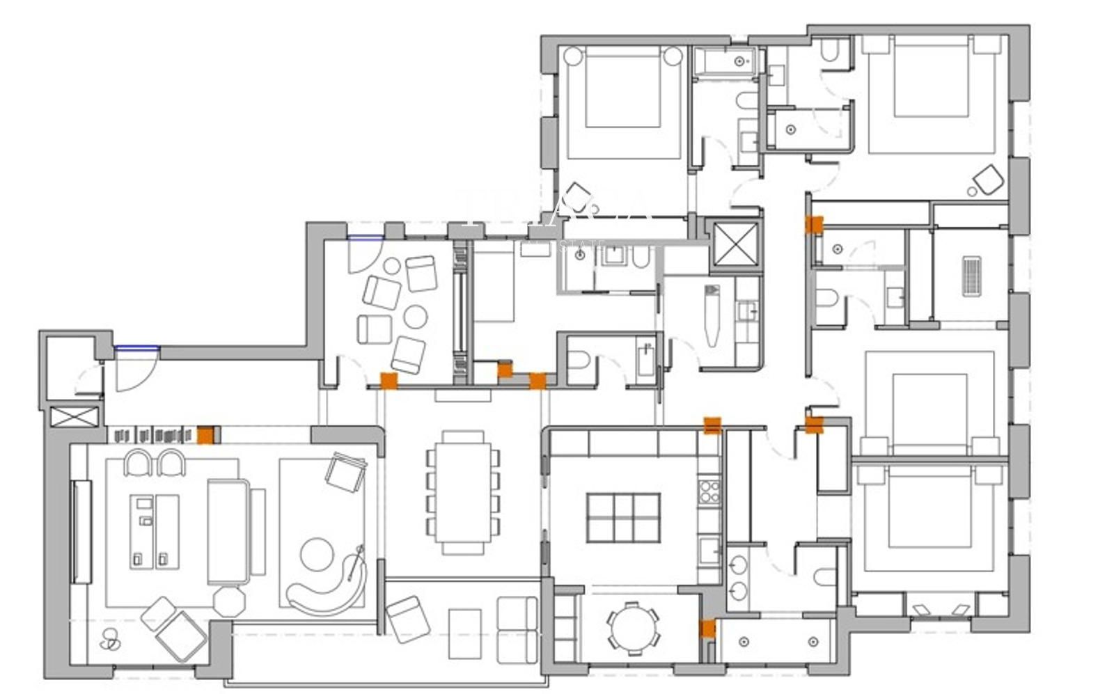 Cuenta con cinco dormitorios y seis baños, además de amplios espacios comunes pensados para el confort y la vida familiar. El salón-comedor, con acceso directo a una gran terraza, se convierte en el auténtico corazón de la vivienda, ideal para disfrutar del aire libre en plena ciudad.