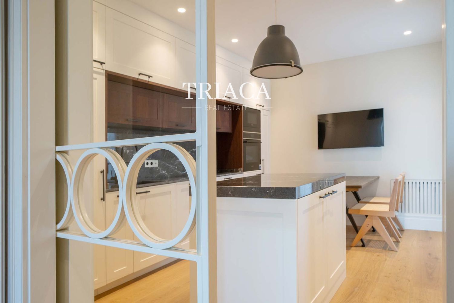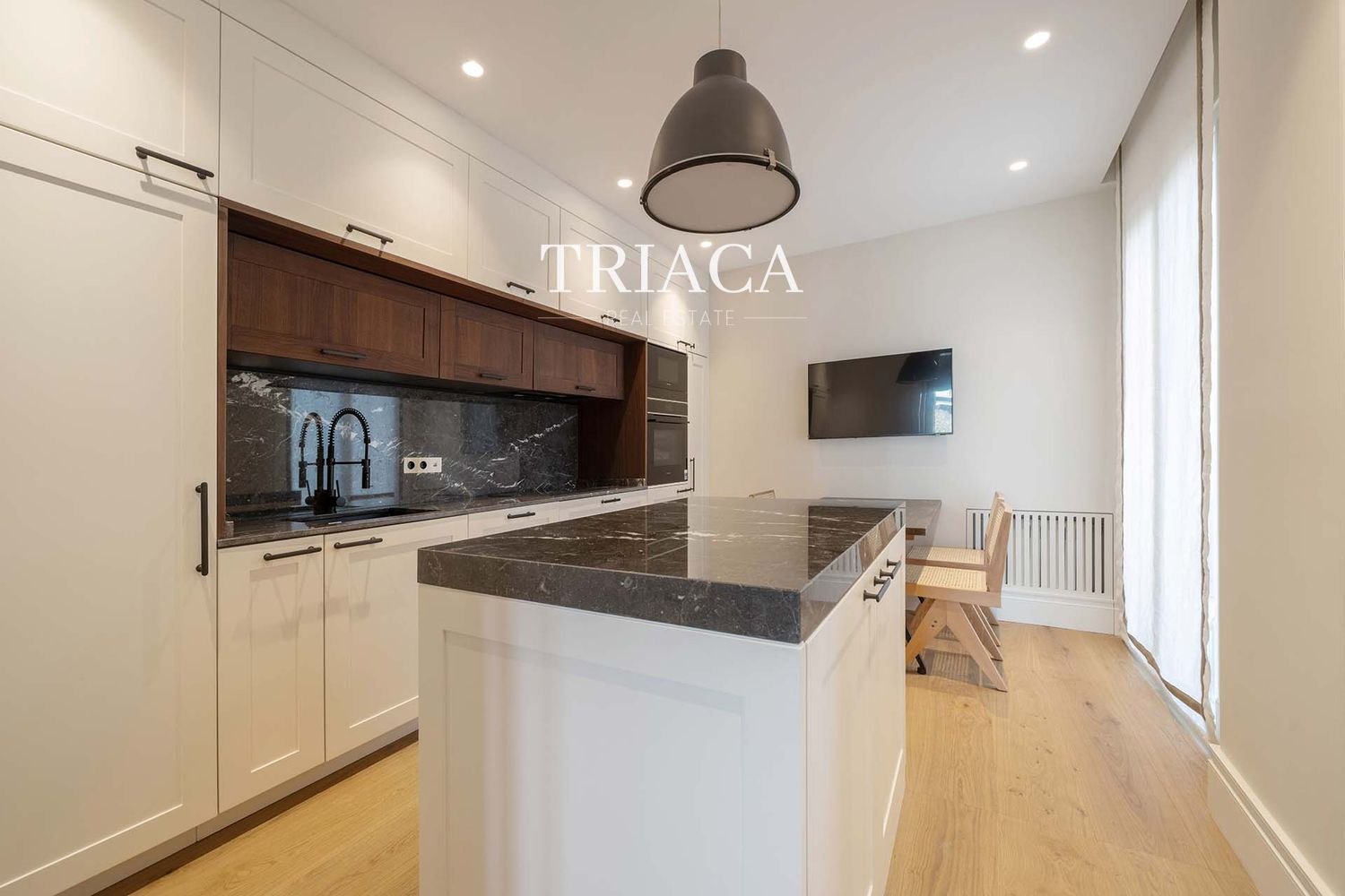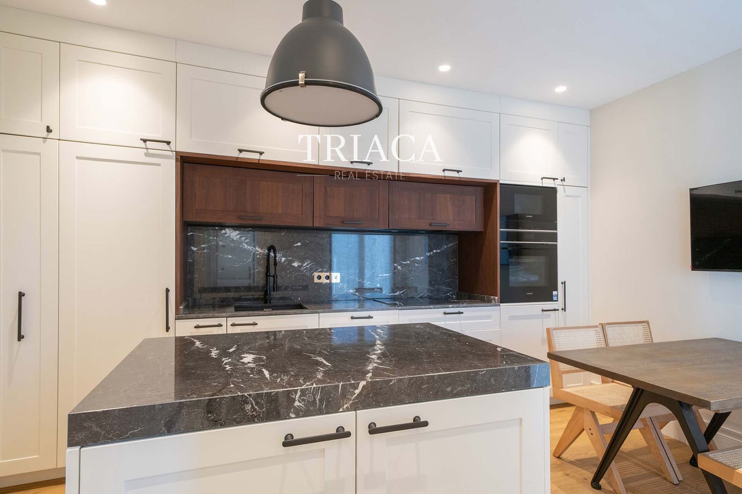 El salón-comedor de gran tamaño conecta de forma fluida con la cocina moderna y totalmente equipada, creando un ambiente ideal tanto para la vida diaria como para el entretenimiento.